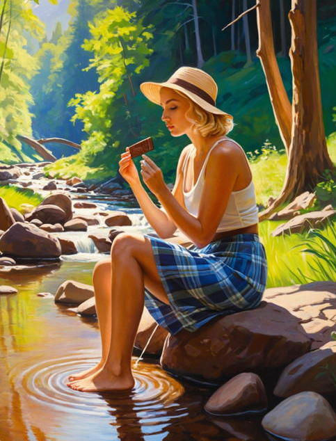 Woman eating chocolate bar outdoors.